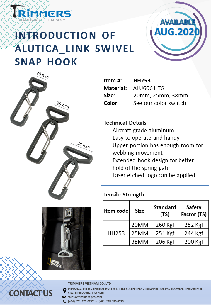 Korean About usCompanyCompany IntroductionCompany ProfileCILocationBusinessBusiness InformationOffice & FactoryCore ValuesOur CustomersStrengthsQuality ControlMaterialDesign & DevelopmentNon-stop Production ProcessIntegrated Structural DesignNewsCompany NewsOversea ShowTrimmers Booth Position OROutdoor Friedrichshafen, DEOutdoor Winter Market 2016Outdoor Friedrichshafen, DEOutdoor Summer Market 2016Trimmers Booth Position OROutdoor Friedrichshafen, DEOutdoor Retailer + Snow ShowISPO Munich Show 2018ISPO Munich Show 20192019 Outdoor Retailer SnowISPO Munich Show Jun,2019Company ActivitiesProduct NewsRetractable HandleBottom Compartment SystemsWheelZipper PullerMetal ComponentPlasticFrameBlogTipsMachineryProductsTravel & GearBottom CompartmentXAD Bottom CompartmentCaliber SeriesEdge Bottom CompartmentMalibu SeriesLocomo SeriesAkita SeriesSuperlite seriesHybrid seriesSantana SeriesHybrid SeriesHJHASDAAll In One SystemsRecessed Spinner Wheel SeriesSpaceShip seriesFeatherLite seriesRetractable HandleAkitaLocomoCruiser seriesCaliber seriesHybrid seriesSpeedLite seriesSuperLite seriesLooperColeIbiza seriesMalibu seriesIce Breaker seriesSolsticeWheelMalibu SeriesAkita SeriesSantana Spinner WheelSpinner Wheel seriesLocomo WheelCruiser seriesCaliber seriesHybrid seriesSuperLite seriesSpeedLite seriesIceBreaker seriesBow TypeLoop seriesTradi seriesSolstice SeriesPlastic ComponentEnd Cap BuckleLadderLockCordLockWebbing TiePower StrapViper Power StrapCamlockPivot HookLoopTriglideD-RingFoot and RailTop / Side HandleProtector & Skid PlateFoot & RailTop HandleLogoLogo PlateSkid Plate & ProtectorProtectorSkid PlateTactical & SafetySide-release BuckleT8_LayerT9_ShieldBags & ApparelsMetal ComponentTension HookShorty Tension HookClip HookSnap HookD-RingTension RingTriglideTension LockToggleLoopWeb ButtonContinental DividerTrekking HolderSternum SliderPull TapCam Tension HookCamlockSR BuckleTent StakeAluminum RulerMetal End TapStructural FrameCarabinerCarabinerCarabinerT3T3 PROBeltBeltZipper PullerZipper PullerMetAstics™AluticaPlasticWeb HandleCamping & OverlandCommute CarrierSnow ShoesChairContactContact InfoHEADGERMANYITALIAKOREAJAPANUKISRAEL About usCompanyCompany IntroductionCompany ProfileCILocationBusinessBusiness InformationOffice & FactoryCore ValuesOur CustomersStrengthsQuality ControlMaterialDesign & DevelopmentNon-stop Production ProcessIntegrated Structural DesignNewsCompany NewsOversea ShowTrimmers Booth Position OROutdoor Friedrichshafen, DEOutdoor Winter Market 2016Outdoor Friedrichshafen, DEOutdoor Summer Market 2016Trimmers Booth Position OROutdoor Friedrichshafen, DEOutdoor Retailer + Snow ShowISPO Munich Show 2018ISPO Munich Show 20192019 Outdoor Retailer SnowISPO Munich Show Jun,2019Company ActivitiesProduct NewsRetractable HandleBottom Compartment SystemsWheelZipper PullerMetal ComponentPlasticFrameBlogTipsMachineryProductsTravel & GearBottom CompartmentXAD Bottom CompartmentCaliber SeriesEdge Bottom CompartmentMalibu SeriesLocomo SeriesAkita SeriesSuperlite seriesHybrid seriesSantana SeriesHybrid SeriesHJHASDAAll In One SystemsRecessed Spinner Wheel SeriesSpaceShip seriesFeatherLite seriesRetractable HandleAkitaLocomoCruiser seriesCaliber seriesHybrid seriesSpeedLite seriesSuperLite seriesLooperColeIbiza seriesMalibu seriesIce Breaker seriesSolsticeWheelMalibu SeriesAkita SeriesSantana Spinner WheelSpinner Wheel seriesLocomo WheelCruiser seriesCaliber seriesHybrid seriesSuperLite seriesSpeedLite seriesIceBreaker seriesBow TypeLoop seriesTradi seriesSolstice SeriesPlastic ComponentEnd Cap BuckleLadderLockCordLockWebbing TiePower StrapViper Power StrapCamlockPivot HookLoopTriglideD-RingFoot and RailTop / Side HandleProtector & Skid PlateFoot & RailTop HandleLogoLogo PlateSkid Plate & ProtectorProtectorSkid PlateTactical & SafetySide-release BuckleT8_LayerT9_ShieldBags & ApparelsMetal ComponentTension HookShorty Tension HookClip HookSnap HookD-RingTension RingTriglideTension LockToggleLoopWeb ButtonContinental DividerTrekking HolderSternum SliderPull TapCam Tension HookCamlockSR BuckleTent StakeAluminum RulerMetal End TapStructural FrameCarabinerCarabinerCarabinerT3T3 PROBeltBeltZipper PullerZipper PullerMetAstics™AluticaPlasticWeb HandleCamping & OverlandCommute CarrierSnow ShoesChairContactContact InfoHEADGERMANYITALIAKOREAJAPANUKISRAEL Company News Oversea ShowTrimmers Booth Position OROutdoor Friedrichshafen, DEOutdoor Winter Market 2016Outdoor Friedrichshafen, DEOutdoor Summer Market 2016Trimmers Booth Position OROutdoor Friedrichshafen, DEOutdoor Retailer + Snow ShowISPO Munich Show 2018ISPO Munich Show 20192019 Outdoor Retailer SnowISPO Munich Show Jun,2019Company Activities Product News Retractable HandleBottom Compartment SystemsWheelZipper PullerMetal ComponentPlasticFrame Blog TipsMachinery Alutica_Link Swivel Snap Hook PDF Download Other News Alutica Tilt Head: Bottle Opener Tension Lock (HH164) & Bottle Opener D-Ring (HH146) Item#: HH164 & HH146 T3 PRO_Loop Item#: HH235 T3 PRO D-ring (HH226) & T3 PRO Double D-ring (HH227) Item#: HH226 & HH227 T3 PRO (Shorty) Tension Hook Item#: HH228 & HH229 T3 PRO_Triglide Item#: HH321 T3 PRO_Webbing Toggle Item#: HH244 e-Catalogue HARDWARE OF TRAVEL & CAMPING 2024 HARDWARE OF BAGS & APPARELS 2024 METAL & PLASTIC COMPONENT T3 PRO_METAL COMPONENT (*) Required Information (*) Required Information (*) Required Information Download Product Highlights Metal / Plastic / Zip-pull P.7 Metal / Plastic / Zip-pull P.6 Metal / Plastic / Zip-pull P.5 Metal / Plastic / Zip-pull P.4 Metal / Plastic / Zip-pull P.3 Metal / Plastic / Zip-pull P.2 Metal / Plastic / Zip-pull P.1 Handles / Wheels / Hard shell P.3 Handles / Wheels / Hard shell P.2 Handles / Wheels / Hard shell P.1 Frame Flyers
