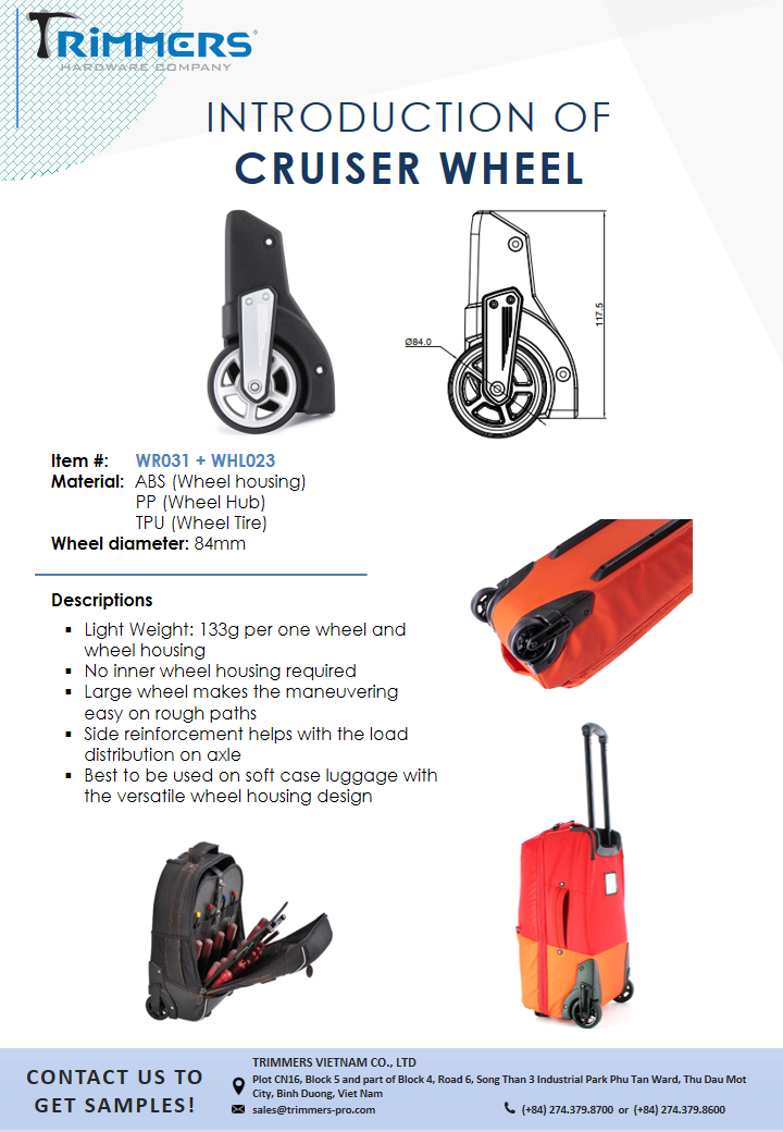 Korean About usCompanyCompany IntroductionCompany ProfileCILocationBusinessBusiness InformationOffice & FactoryCore ValuesOur CustomersStrengthsQuality ControlMaterialDesign & DevelopmentNon-stop Production ProcessIntegrated Structural DesignNewsCompany NewsOversea ShowTrimmers Booth Position OROutdoor Friedrichshafen, DEOutdoor Winter Market 2016Outdoor Friedrichshafen, DEOutdoor Summer Market 2016Trimmers Booth Position OROutdoor Friedrichshafen, DEOutdoor Retailer + Snow ShowISPO Munich Show 2018ISPO Munich Show 20192019 Outdoor Retailer SnowISPO Munich Show Jun,2019Company ActivitiesProduct NewsRetractable HandleBottom Compartment SystemsWheelZipper PullerMetal ComponentPlasticFrameBlogTipsMachineryProductsTravel & GearBottom CompartmentXAD Bottom CompartmentCaliber SeriesEdge Bottom CompartmentMalibu SeriesLocomo SeriesAkita SeriesSuperlite seriesHybrid seriesSantana SeriesHybrid SeriesHJHASDAAll In One SystemsRecessed Spinner Wheel SeriesSpaceShip seriesFeatherLite seriesRetractable HandleAkitaLocomoCruiser seriesCaliber seriesHybrid seriesSpeedLite seriesSuperLite seriesLooperColeIbiza seriesMalibu seriesIce Breaker seriesSolsticeWheelMalibu SeriesAkita SeriesSantana Spinner WheelSpinner Wheel seriesLocomo WheelCruiser seriesCaliber seriesHybrid seriesSuperLite seriesSpeedLite seriesIceBreaker seriesBow TypeLoop seriesTradi seriesSolstice SeriesPlastic ComponentEnd Cap BuckleLadderLockCordLockWebbing TiePower StrapViper Power StrapCamlockPivot HookLoopTriglideD-RingFoot and RailTop / Side HandleProtector & Skid PlateFoot & RailTop HandleLogoLogo PlateSkid Plate & ProtectorProtectorSkid PlateTactical & SafetySide-release BuckleT8_LayerT9_ShieldBags & ApparelsMetal ComponentTension HookShorty Tension HookClip HookSnap HookD-RingTension RingTriglideTension LockToggleLoopWeb ButtonContinental DividerTrekking HolderSternum SliderPull TapCam Tension HookCamlockSR BuckleTent StakeAluminum RulerMetal End TapStructural FrameCarabinerCarabinerCarabinerT3T3 PROBeltBeltZipper PullerZipper PullerMetAstics™AluticaPlasticWeb HandleCamping & OverlandCommute CarrierSnow ShoesChairContactContact InfoHEADGERMANYITALIAKOREAJAPANUKISRAEL About usCompanyCompany IntroductionCompany ProfileCILocationBusinessBusiness InformationOffice & FactoryCore ValuesOur CustomersStrengthsQuality ControlMaterialDesign & DevelopmentNon-stop Production ProcessIntegrated Structural DesignNewsCompany NewsOversea ShowTrimmers Booth Position OROutdoor Friedrichshafen, DEOutdoor Winter Market 2016Outdoor Friedrichshafen, DEOutdoor Summer Market 2016Trimmers Booth Position OROutdoor Friedrichshafen, DEOutdoor Retailer + Snow ShowISPO Munich Show 2018ISPO Munich Show 20192019 Outdoor Retailer SnowISPO Munich Show Jun,2019Company ActivitiesProduct NewsRetractable HandleBottom Compartment SystemsWheelZipper PullerMetal ComponentPlasticFrameBlogTipsMachineryProductsTravel & GearBottom CompartmentXAD Bottom CompartmentCaliber SeriesEdge Bottom CompartmentMalibu SeriesLocomo SeriesAkita SeriesSuperlite seriesHybrid seriesSantana SeriesHybrid SeriesHJHASDAAll In One SystemsRecessed Spinner Wheel SeriesSpaceShip seriesFeatherLite seriesRetractable HandleAkitaLocomoCruiser seriesCaliber seriesHybrid seriesSpeedLite seriesSuperLite seriesLooperColeIbiza seriesMalibu seriesIce Breaker seriesSolsticeWheelMalibu SeriesAkita SeriesSantana Spinner WheelSpinner Wheel seriesLocomo WheelCruiser seriesCaliber seriesHybrid seriesSuperLite seriesSpeedLite seriesIceBreaker seriesBow TypeLoop seriesTradi seriesSolstice SeriesPlastic ComponentEnd Cap BuckleLadderLockCordLockWebbing TiePower StrapViper Power StrapCamlockPivot HookLoopTriglideD-RingFoot and RailTop / Side HandleProtector & Skid PlateFoot & RailTop HandleLogoLogo PlateSkid Plate & ProtectorProtectorSkid PlateTactical & SafetySide-release BuckleT8_LayerT9_ShieldBags & ApparelsMetal ComponentTension HookShorty Tension HookClip HookSnap HookD-RingTension RingTriglideTension LockToggleLoopWeb ButtonContinental DividerTrekking HolderSternum SliderPull TapCam Tension HookCamlockSR BuckleTent StakeAluminum RulerMetal End TapStructural FrameCarabinerCarabinerCarabinerT3T3 PROBeltBeltZipper PullerZipper PullerMetAstics™AluticaPlasticWeb HandleCamping & OverlandCommute CarrierSnow ShoesChairContactContact InfoHEADGERMANYITALIAKOREAJAPANUKISRAEL Company News Oversea ShowTrimmers Booth Position OROutdoor Friedrichshafen, DEOutdoor Winter Market 2016Outdoor Friedrichshafen, DEOutdoor Summer Market 2016Trimmers Booth Position OROutdoor Friedrichshafen, DEOutdoor Retailer + Snow ShowISPO Munich Show 2018ISPO Munich Show 20192019 Outdoor Retailer SnowISPO Munich Show Jun,2019Company Activities Product News Retractable HandleBottom Compartment SystemsWheelZipper PullerMetal ComponentPlasticFrame Blog TipsMachinery Cruiser Wheel_84 PDF Download Other News Santana Spinner: Hairline Double Wheel 50 (WR079 + WHL058_4) & Cut Rim Double Wheel 50 (WR079 + WHL058_1) Item#: WR079 + WHL058_4 & WR079 + WHL058_1 New Santana Spinner Wheel Item#: WR111+WHL058 Solstice Spinner Hairline Cap Double Wheel 50 Item#: WR099 + WHL058 New Hyper Elastic Spinner Double Wheel 58 Item#: WR097 + WHL077 Malibu Wheel Item#: WR063 + WHL032 Santana Spinner Wheel Hyper Elastic Double Wheel 58 for Hardshell Item#: WR061 + WHL077 e-Catalogue HARDWARE OF TRAVEL & CAMPING 2024 HARDWARE OF BAGS & APPARELS 2024 METAL & PLASTIC COMPONENT T3 PRO_METAL COMPONENT (*) Required Information (*) Required Information (*) Required Information Download Product Highlights Metal / Plastic / Zip-pull P.7 Metal / Plastic / Zip-pull P.6 Metal / Plastic / Zip-pull P.5 Metal / Plastic / Zip-pull P.4 Metal / Plastic / Zip-pull P.3 Metal / Plastic / Zip-pull P.2 Metal / Plastic / Zip-pull P.1 Handles / Wheels / Hard shell P.3 Handles / Wheels / Hard shell P.2 Handles / Wheels / Hard shell P.1 Frame Flyers