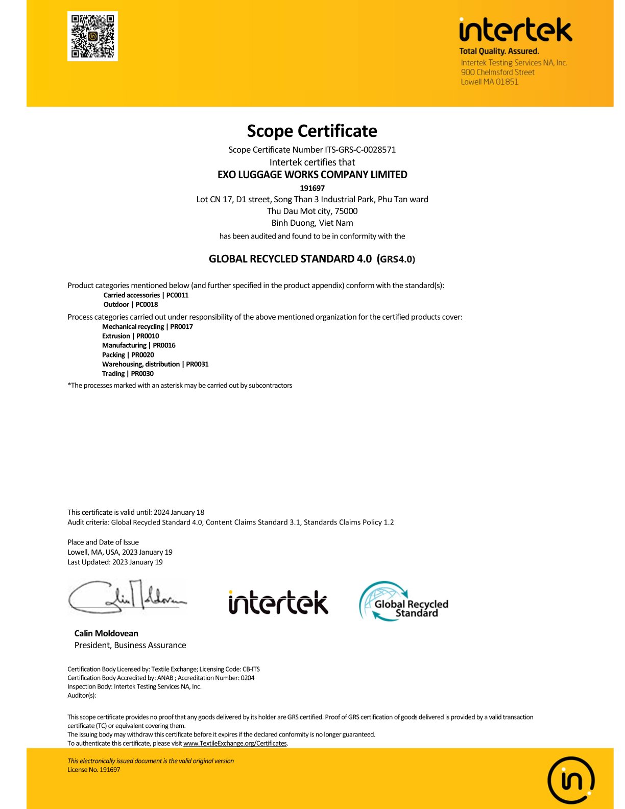 This certification was acquired by us for the product categories of Outdoor and Carried Accessories. A thorough inspection of our processing steps and activities in manufacturing, packing, warehousing, extrusion, and mechanical recycling was conducted to acquire this certification. A routine inspection must be conducted and passed to maintain this certification. We are very pleased to take our steps to preserve the environment.