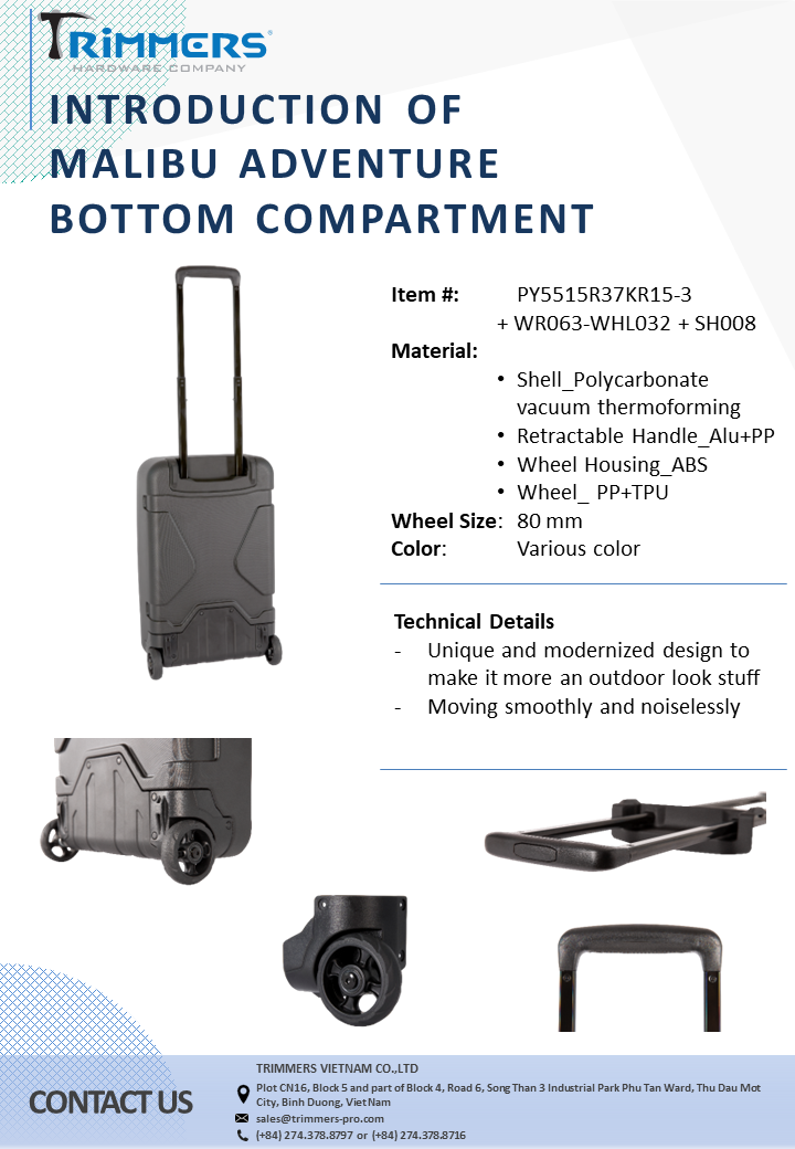 Korean About usCompanyCompany IntroductionCompany ProfileCILocationBusinessBusiness InformationOffice & FactoryCore ValuesOur CustomersStrengthsQuality ControlMaterialDesign & DevelopmentNon-stop Production ProcessIntegrated Structural DesignNewsCompany NewsOversea ShowTrimmers Booth Position OROutdoor Friedrichshafen, DEOutdoor Winter Market 2016Outdoor Friedrichshafen, DEOutdoor Summer Market 2016Trimmers Booth Position OROutdoor Friedrichshafen, DEOutdoor Retailer + Snow ShowISPO Munich Show 2018ISPO Munich Show 20192019 Outdoor Retailer SnowISPO Munich Show Jun,2019Company ActivitiesProduct NewsRetractable HandleBottom Compartment SystemsWheelZipper PullerMetal ComponentPlasticFrameBlogTipsMachineryProductsTravel & GearBottom CompartmentXAD Bottom CompartmentCaliber SeriesEdge Bottom CompartmentMalibu SeriesLocomo SeriesAkita SeriesSuperlite seriesHybrid seriesSantana SeriesHybrid SeriesHJHASDAAll In One SystemsRecessed Spinner Wheel SeriesSpaceShip seriesFeatherLite seriesRetractable HandleAkitaLocomoCruiser seriesCaliber seriesHybrid seriesSpeedLite seriesSuperLite seriesLooperColeIbiza seriesMalibu seriesIce Breaker seriesSolsticeWheelMalibu SeriesAkita SeriesSantana Spinner WheelSpinner Wheel seriesLocomo WheelCruiser seriesCaliber seriesHybrid seriesSuperLite seriesSpeedLite seriesIceBreaker seriesBow TypeLoop seriesTradi seriesSolstice SeriesPlastic ComponentEnd Cap BuckleLadderLockCordLockWebbing TiePower StrapViper Power StrapCamlockPivot HookLoopTriglideD-RingFoot and RailTop / Side HandleProtector & Skid PlateFoot & RailTop HandleLogoLogo PlateSkid Plate & ProtectorProtectorSkid PlateTactical & SafetySide-release BuckleT8_LayerT9_ShieldBags & ApparelsMetal ComponentTension HookShorty Tension HookClip HookSnap HookD-RingTension RingTriglideTension LockToggleLoopWeb ButtonContinental DividerTrekking HolderSternum SliderPull TapCam Tension HookCamlockSR BuckleTent StakeAluminum RulerMetal End TapStructural FrameCarabinerCarabinerCarabinerT3T3 PROBeltBeltZipper PullerZipper PullerMetAstics™AluticaPlasticWeb HandleCamping & OverlandCommute CarrierSnow ShoesChairContactContact InfoHEADGERMANYITALIAKOREAJAPANUKISRAEL About usCompanyCompany IntroductionCompany ProfileCILocationBusinessBusiness InformationOffice & FactoryCore ValuesOur CustomersStrengthsQuality ControlMaterialDesign & DevelopmentNon-stop Production ProcessIntegrated Structural DesignNewsCompany NewsOversea ShowTrimmers Booth Position OROutdoor Friedrichshafen, DEOutdoor Winter Market 2016Outdoor Friedrichshafen, DEOutdoor Summer Market 2016Trimmers Booth Position OROutdoor Friedrichshafen, DEOutdoor Retailer + Snow ShowISPO Munich Show 2018ISPO Munich Show 20192019 Outdoor Retailer SnowISPO Munich Show Jun,2019Company ActivitiesProduct NewsRetractable HandleBottom Compartment SystemsWheelZipper PullerMetal ComponentPlasticFrameBlogTipsMachineryProductsTravel & GearBottom CompartmentXAD Bottom CompartmentCaliber SeriesEdge Bottom CompartmentMalibu SeriesLocomo SeriesAkita SeriesSuperlite seriesHybrid seriesSantana SeriesHybrid SeriesHJHASDAAll In One SystemsRecessed Spinner Wheel SeriesSpaceShip seriesFeatherLite seriesRetractable HandleAkitaLocomoCruiser seriesCaliber seriesHybrid seriesSpeedLite seriesSuperLite seriesLooperColeIbiza seriesMalibu seriesIce Breaker seriesSolsticeWheelMalibu SeriesAkita SeriesSantana Spinner WheelSpinner Wheel seriesLocomo WheelCruiser seriesCaliber seriesHybrid seriesSuperLite seriesSpeedLite seriesIceBreaker seriesBow TypeLoop seriesTradi seriesSolstice SeriesPlastic ComponentEnd Cap BuckleLadderLockCordLockWebbing TiePower StrapViper Power StrapCamlockPivot HookLoopTriglideD-RingFoot and RailTop / Side HandleProtector & Skid PlateFoot & RailTop HandleLogoLogo PlateSkid Plate & ProtectorProtectorSkid PlateTactical & SafetySide-release BuckleT8_LayerT9_ShieldBags & ApparelsMetal ComponentTension HookShorty Tension HookClip HookSnap HookD-RingTension RingTriglideTension LockToggleLoopWeb ButtonContinental DividerTrekking HolderSternum SliderPull TapCam Tension HookCamlockSR BuckleTent StakeAluminum RulerMetal End TapStructural FrameCarabinerCarabinerCarabinerT3T3 PROBeltBeltZipper PullerZipper PullerMetAstics™AluticaPlasticWeb HandleCamping & OverlandCommute CarrierSnow ShoesChairContactContact InfoHEADGERMANYITALIAKOREAJAPANUKISRAEL Company News Oversea ShowTrimmers Booth Position OROutdoor Friedrichshafen, DEOutdoor Winter Market 2016Outdoor Friedrichshafen, DEOutdoor Summer Market 2016Trimmers Booth Position OROutdoor Friedrichshafen, DEOutdoor Retailer + Snow ShowISPO Munich Show 2018ISPO Munich Show 20192019 Outdoor Retailer SnowISPO Munich Show Jun,2019Company Activities Product News Retractable HandleBottom Compartment SystemsWheelZipper PullerMetal ComponentPlasticFrame Blog TipsMachinery Malibu Bottom Compartment PDF Download Other News Akita Bottom Compartment Item#: PY7205R64R50_3 + WR095 + WHL053 + SH127 Locomo Pro Hardshell Bottom Compartment Item#: PY6703R60R25 + WR062 + WHL045 Caliber Wide Spinner Bottom Compartment Item#: PY8403L76R66-3 + WR061 + WHL034 + SH179FR Locomo Adventure Bottom Compartment Item#: PY3203AL77W67 + WR062 + WHL045 Eco Program Of Trimmers Locomo Adventure Hardshell Bottom Compartment Item#: PY3203AL77W67 + WR062 + WHL045 + CP011 e-Catalogue HARDWARE OF TRAVEL & CAMPING 2024 HARDWARE OF BAGS & APPARELS 2024 METAL & PLASTIC COMPONENT T3 PRO_METAL COMPONENT (*) Required Information (*) Required Information (*) Required Information Download Product Highlights Metal / Plastic / Zip-pull P.7 Metal / Plastic / Zip-pull P.6 Metal / Plastic / Zip-pull P.5 Metal / Plastic / Zip-pull P.4 Metal / Plastic / Zip-pull P.3 Metal / Plastic / Zip-pull P.2 Metal / Plastic / Zip-pull P.1 Handles / Wheels / Hard shell P.3 Handles / Wheels / Hard shell P.2 Handles / Wheels / Hard shell P.1 Frame Flyers