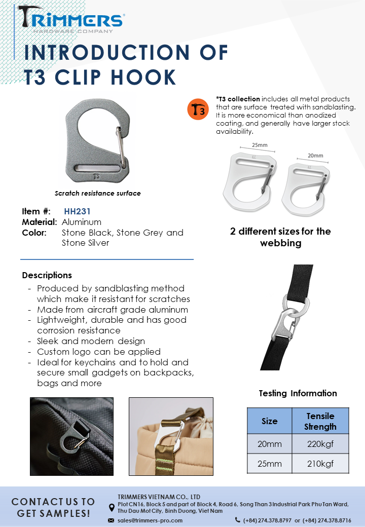 Korean About usCompanyCompany IntroductionCompany ProfileCILocationBusinessBusiness InformationOffice & FactoryCore ValuesOur CustomersStrengthsQuality ControlMaterialDesign & DevelopmentNon-stop Production ProcessIntegrated Structural DesignNewsCompany NewsOversea ShowTrimmers Booth Position OROutdoor Friedrichshafen, DEOutdoor Winter Market 2016Outdoor Friedrichshafen, DEOutdoor Summer Market 2016Trimmers Booth Position OROutdoor Friedrichshafen, DEOutdoor Retailer + Snow ShowISPO Munich Show 2018ISPO Munich Show 20192019 Outdoor Retailer SnowISPO Munich Show Jun,2019Company ActivitiesProduct NewsRetractable HandleBottom Compartment SystemsWheelZipper PullerMetal ComponentPlasticFrameBlogTipsMachineryProductsTravel & GearBottom CompartmentXAD Bottom CompartmentCaliber SeriesEdge Bottom CompartmentMalibu SeriesLocomo SeriesAkita SeriesSuperlite seriesHybrid seriesSantana SeriesHybrid SeriesHJHASDAAll In One SystemsRecessed Spinner Wheel SeriesSpaceShip seriesFeatherLite seriesRetractable HandleAkitaLocomoCruiser seriesCaliber seriesHybrid seriesSpeedLite seriesSuperLite seriesLooperColeIbiza seriesMalibu seriesIce Breaker seriesSolsticeWheelMalibu SeriesAkita SeriesSantana Spinner WheelSpinner Wheel seriesLocomo WheelCruiser seriesCaliber seriesHybrid seriesSuperLite seriesSpeedLite seriesIceBreaker seriesBow TypeLoop seriesTradi seriesSolstice SeriesPlastic ComponentEnd Cap BuckleLadderLockCordLockWebbing TiePower StrapViper Power StrapCamlockPivot HookLoopTriglideD-RingFoot and RailTop / Side HandleProtector & Skid PlateFoot & RailTop HandleLogoLogo PlateSkid Plate & ProtectorProtectorSkid PlateTactical & SafetySide-release BuckleT8_LayerT9_ShieldBags & ApparelsMetal ComponentTension HookShorty Tension HookClip HookSnap HookD-RingTension RingTriglideTension LockToggleLoopWeb ButtonContinental DividerTrekking HolderSternum SliderPull TapCam Tension HookCamlockSR BuckleTent StakeAluminum RulerMetal End TapStructural FrameCarabinerCarabinerCarabinerT3T3 PROBeltBeltZipper PullerZipper PullerMetAstics™AluticaPlasticWeb HandleCamping & OverlandCommute CarrierSnow ShoesChairContactContact InfoHEADGERMANYITALIAKOREAJAPANUKISRAEL About usCompanyCompany IntroductionCompany ProfileCILocationBusinessBusiness InformationOffice & FactoryCore ValuesOur CustomersStrengthsQuality ControlMaterialDesign & DevelopmentNon-stop Production ProcessIntegrated Structural DesignNewsCompany NewsOversea ShowTrimmers Booth Position OROutdoor Friedrichshafen, DEOutdoor Winter Market 2016Outdoor Friedrichshafen, DEOutdoor Summer Market 2016Trimmers Booth Position OROutdoor Friedrichshafen, DEOutdoor Retailer + Snow ShowISPO Munich Show 2018ISPO Munich Show 20192019 Outdoor Retailer SnowISPO Munich Show Jun,2019Company ActivitiesProduct NewsRetractable HandleBottom Compartment SystemsWheelZipper PullerMetal ComponentPlasticFrameBlogTipsMachineryProductsTravel & GearBottom CompartmentXAD Bottom CompartmentCaliber SeriesEdge Bottom CompartmentMalibu SeriesLocomo SeriesAkita SeriesSuperlite seriesHybrid seriesSantana SeriesHybrid SeriesHJHASDAAll In One SystemsRecessed Spinner Wheel SeriesSpaceShip seriesFeatherLite seriesRetractable HandleAkitaLocomoCruiser seriesCaliber seriesHybrid seriesSpeedLite seriesSuperLite seriesLooperColeIbiza seriesMalibu seriesIce Breaker seriesSolsticeWheelMalibu SeriesAkita SeriesSantana Spinner WheelSpinner Wheel seriesLocomo WheelCruiser seriesCaliber seriesHybrid seriesSuperLite seriesSpeedLite seriesIceBreaker seriesBow TypeLoop seriesTradi seriesSolstice SeriesPlastic ComponentEnd Cap BuckleLadderLockCordLockWebbing TiePower StrapViper Power StrapCamlockPivot HookLoopTriglideD-RingFoot and RailTop / Side HandleProtector & Skid PlateFoot & RailTop HandleLogoLogo PlateSkid Plate & ProtectorProtectorSkid PlateTactical & SafetySide-release BuckleT8_LayerT9_ShieldBags & ApparelsMetal ComponentTension HookShorty Tension HookClip HookSnap HookD-RingTension RingTriglideTension LockToggleLoopWeb ButtonContinental DividerTrekking HolderSternum SliderPull TapCam Tension HookCamlockSR BuckleTent StakeAluminum RulerMetal End TapStructural FrameCarabinerCarabinerCarabinerT3T3 PROBeltBeltZipper PullerZipper PullerMetAstics™AluticaPlasticWeb HandleCamping & OverlandCommute CarrierSnow ShoesChairContactContact InfoHEADGERMANYITALIAKOREAJAPANUKISRAEL Company News Oversea ShowTrimmers Booth Position OROutdoor Friedrichshafen, DEOutdoor Winter Market 2016Outdoor Friedrichshafen, DEOutdoor Summer Market 2016Trimmers Booth Position OROutdoor Friedrichshafen, DEOutdoor Retailer + Snow ShowISPO Munich Show 2018ISPO Munich Show 20192019 Outdoor Retailer SnowISPO Munich Show Jun,2019Company Activities Product News Retractable HandleBottom Compartment SystemsWheelZipper PullerMetal ComponentPlasticFrame Blog TipsMachinery T3_Clip Hook PDF Download Other News Alutica Tilt Head: Bottle Opener Tension Lock (HH164) & Bottle Opener D-Ring (HH146) Item#: HH164 & HH146 T3 PRO_Loop Item#: HH235 T3 PRO D-ring (HH226) & T3 PRO Double D-ring (HH227) Item#: HH226 & HH227 T3 PRO (Shorty) Tension Hook Item#: HH228 & HH229 T3 PRO_Triglide Item#: HH321 T3 PRO_Webbing Toggle Item#: HH244 e-Catalogue HARDWARE OF TRAVEL & CAMPING 2024 HARDWARE OF BAGS & APPARELS 2024 METAL & PLASTIC COMPONENT T3 PRO_METAL COMPONENT (*) Required Information (*) Required Information (*) Required Information Download Product Highlights Metal / Plastic / Zip-pull P.7 Metal / Plastic / Zip-pull P.6 Metal / Plastic / Zip-pull P.5 Metal / Plastic / Zip-pull P.4 Metal / Plastic / Zip-pull P.3 Metal / Plastic / Zip-pull P.2 Metal / Plastic / Zip-pull P.1 Handles / Wheels / Hard shell P.3 Handles / Wheels / Hard shell P.2 Handles / Wheels / Hard shell P.1 Frame Flyers