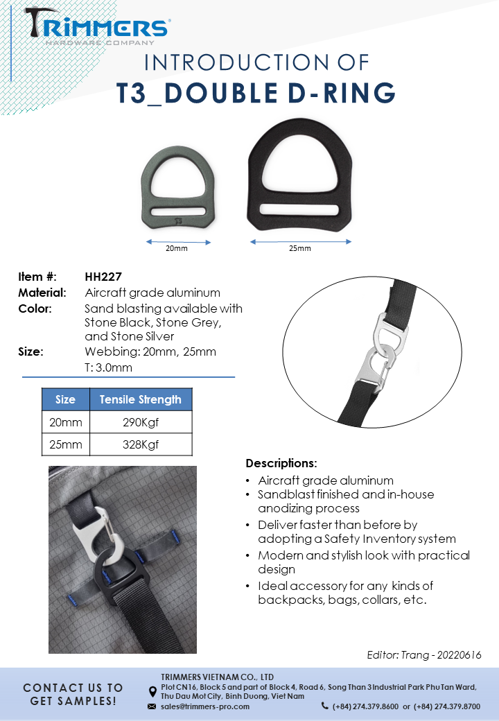 Korean About usCompanyCompany IntroductionCompany ProfileCILocationBusinessBusiness InformationOffice & FactoryCore ValuesOur CustomersStrengthsQuality ControlMaterialDesign & DevelopmentNon-stop Production ProcessIntegrated Structural DesignNewsCompany NewsOversea ShowTrimmers Booth Position OROutdoor Friedrichshafen, DEOutdoor Winter Market 2016Outdoor Friedrichshafen, DEOutdoor Summer Market 2016Trimmers Booth Position OROutdoor Friedrichshafen, DEOutdoor Retailer + Snow ShowISPO Munich Show 2018ISPO Munich Show 20192019 Outdoor Retailer SnowISPO Munich Show Jun,2019Company ActivitiesProduct NewsRetractable HandleBottom Compartment SystemsWheelZipper PullerMetal ComponentPlasticFrameBlogTipsMachineryProductsTravel & GearBottom CompartmentXAD Bottom CompartmentCaliber SeriesEdge Bottom CompartmentMalibu SeriesLocomo SeriesAkita SeriesSuperlite seriesHybrid seriesSantana SeriesHybrid SeriesHJHASDAAll In One SystemsRecessed Spinner Wheel SeriesSpaceShip seriesFeatherLite seriesRetractable HandleAkitaLocomoCruiser seriesCaliber seriesHybrid seriesSpeedLite seriesSuperLite seriesLooperColeIbiza seriesMalibu seriesIce Breaker seriesSolsticeWheelMalibu SeriesAkita SeriesSantana Spinner WheelSpinner Wheel seriesLocomo WheelCruiser seriesCaliber seriesHybrid seriesSuperLite seriesSpeedLite seriesIceBreaker seriesBow TypeLoop seriesTradi seriesSolstice SeriesPlastic ComponentEnd Cap BuckleLadderLockCordLockWebbing TiePower StrapViper Power StrapCamlockPivot HookLoopTriglideD-RingFoot and RailTop / Side HandleProtector & Skid PlateFoot & RailTop HandleLogoLogo PlateSkid Plate & ProtectorProtectorSkid PlateTactical & SafetySide-release BuckleT8_LayerT9_ShieldBags & ApparelsMetal ComponentTension HookShorty Tension HookClip HookSnap HookD-RingTension RingTriglideTension LockToggleLoopWeb ButtonContinental DividerTrekking HolderSternum SliderPull TapCam Tension HookCamlockSR BuckleTent StakeAluminum RulerMetal End TapStructural FrameCarabinerCarabinerCarabinerT3T3 PROBeltBeltZipper PullerZipper PullerMetAstics™AluticaPlasticWeb HandleCamping & OverlandCommute CarrierSnow ShoesChairContactContact InfoHEADGERMANYITALIAKOREAJAPANUKISRAEL About usCompanyCompany IntroductionCompany ProfileCILocationBusinessBusiness InformationOffice & FactoryCore ValuesOur CustomersStrengthsQuality ControlMaterialDesign & DevelopmentNon-stop Production ProcessIntegrated Structural DesignNewsCompany NewsOversea ShowTrimmers Booth Position OROutdoor Friedrichshafen, DEOutdoor Winter Market 2016Outdoor Friedrichshafen, DEOutdoor Summer Market 2016Trimmers Booth Position OROutdoor Friedrichshafen, DEOutdoor Retailer + Snow ShowISPO Munich Show 2018ISPO Munich Show 20192019 Outdoor Retailer SnowISPO Munich Show Jun,2019Company ActivitiesProduct NewsRetractable HandleBottom Compartment SystemsWheelZipper PullerMetal ComponentPlasticFrameBlogTipsMachineryProductsTravel & GearBottom CompartmentXAD Bottom CompartmentCaliber SeriesEdge Bottom CompartmentMalibu SeriesLocomo SeriesAkita SeriesSuperlite seriesHybrid seriesSantana SeriesHybrid SeriesHJHASDAAll In One SystemsRecessed Spinner Wheel SeriesSpaceShip seriesFeatherLite seriesRetractable HandleAkitaLocomoCruiser seriesCaliber seriesHybrid seriesSpeedLite seriesSuperLite seriesLooperColeIbiza seriesMalibu seriesIce Breaker seriesSolsticeWheelMalibu SeriesAkita SeriesSantana Spinner WheelSpinner Wheel seriesLocomo WheelCruiser seriesCaliber seriesHybrid seriesSuperLite seriesSpeedLite seriesIceBreaker seriesBow TypeLoop seriesTradi seriesSolstice SeriesPlastic ComponentEnd Cap BuckleLadderLockCordLockWebbing TiePower StrapViper Power StrapCamlockPivot HookLoopTriglideD-RingFoot and RailTop / Side HandleProtector & Skid PlateFoot & RailTop HandleLogoLogo PlateSkid Plate & ProtectorProtectorSkid PlateTactical & SafetySide-release BuckleT8_LayerT9_ShieldBags & ApparelsMetal ComponentTension HookShorty Tension HookClip HookSnap HookD-RingTension RingTriglideTension LockToggleLoopWeb ButtonContinental DividerTrekking HolderSternum SliderPull TapCam Tension HookCamlockSR BuckleTent StakeAluminum RulerMetal End TapStructural FrameCarabinerCarabinerCarabinerT3T3 PROBeltBeltZipper PullerZipper PullerMetAstics™AluticaPlasticWeb HandleCamping & OverlandCommute CarrierSnow ShoesChairContactContact InfoHEADGERMANYITALIAKOREAJAPANUKISRAEL Company News Oversea ShowTrimmers Booth Position OROutdoor Friedrichshafen, DEOutdoor Winter Market 2016Outdoor Friedrichshafen, DEOutdoor Summer Market 2016Trimmers Booth Position OROutdoor Friedrichshafen, DEOutdoor Retailer + Snow ShowISPO Munich Show 2018ISPO Munich Show 20192019 Outdoor Retailer SnowISPO Munich Show Jun,2019Company Activities Product News Retractable HandleBottom Compartment SystemsWheelZipper PullerMetal ComponentPlasticFrame Blog TipsMachinery T3_Double D-Ring PDF Download Other News Alutica Tilt Head: Bottle Opener Tension Lock (HH164) & Bottle Opener D-Ring (HH146) Item#: HH164 & HH146 T3 PRO_Loop Item#: HH235 T3 PRO D-ring (HH226) & T3 PRO Double D-ring (HH227) Item#: HH226 & HH227 T3 PRO (Shorty) Tension Hook Item#: HH228 & HH229 T3 PRO_Triglide Item#: HH321 T3 PRO_Webbing Toggle Item#: HH244 e-Catalogue HARDWARE OF TRAVEL & CAMPING 2024 HARDWARE OF BAGS & APPARELS 2024 METAL & PLASTIC COMPONENT T3 PRO_METAL COMPONENT (*) Required Information (*) Required Information (*) Required Information Download Product Highlights Metal / Plastic / Zip-pull P.7 Metal / Plastic / Zip-pull P.6 Metal / Plastic / Zip-pull P.5 Metal / Plastic / Zip-pull P.4 Metal / Plastic / Zip-pull P.3 Metal / Plastic / Zip-pull P.2 Metal / Plastic / Zip-pull P.1 Handles / Wheels / Hard shell P.3 Handles / Wheels / Hard shell P.2 Handles / Wheels / Hard shell P.1 Frame Flyers