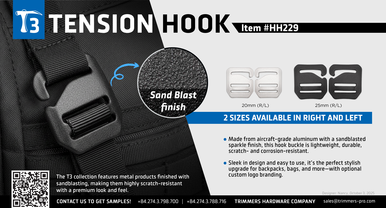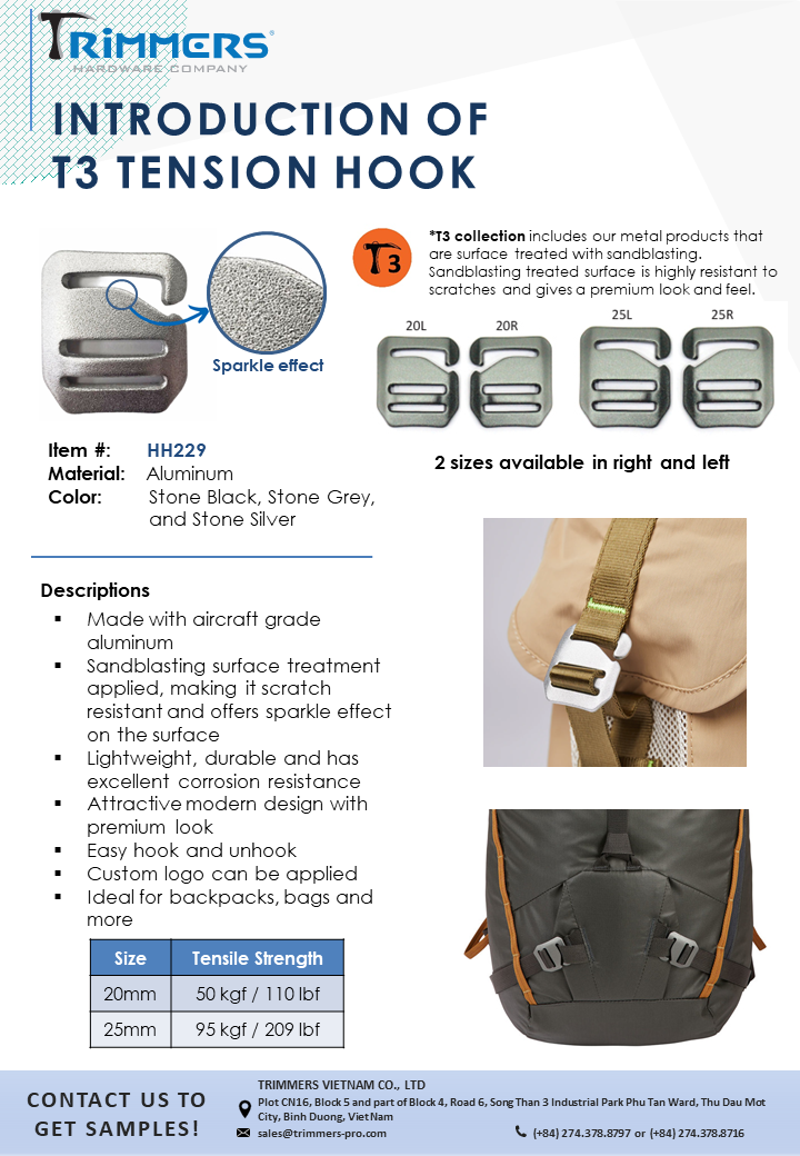 Korean About usCompanyCompany IntroductionCompany ProfileCILocationBusinessBusiness InformationOffice & FactoryCore ValuesOur CustomersStrengthsQuality ControlMaterialDesign & DevelopmentNon-stop Production ProcessIntegrated Structural DesignNewsCompany NewsOversea ShowTrimmers Booth Position OROutdoor Friedrichshafen, DEOutdoor Winter Market 2016Outdoor Friedrichshafen, DEOutdoor Summer Market 2016Trimmers Booth Position OROutdoor Friedrichshafen, DEOutdoor Retailer + Snow ShowISPO Munich Show 2018ISPO Munich Show 20192019 Outdoor Retailer SnowISPO Munich Show Jun,2019Company ActivitiesProduct NewsRetractable HandleBottom Compartment SystemsWheelZipper PullerMetal ComponentPlasticFrameBlogTipsMachineryProductsTravel & GearBottom CompartmentXAD Bottom CompartmentCaliber SeriesEdge Bottom CompartmentMalibu SeriesLocomo SeriesAkita SeriesSuperlite seriesHybrid seriesSantana SeriesHybrid SeriesHJHASDAAll In One SystemsRecessed Spinner Wheel SeriesSpaceShip seriesFeatherLite seriesRetractable HandleAkitaLocomoCruiser seriesCaliber seriesHybrid seriesSpeedLite seriesSuperLite seriesLooperColeIbiza seriesMalibu seriesIce Breaker seriesSolsticeWheelMalibu SeriesAkita SeriesSantana Spinner WheelSpinner Wheel seriesLocomo WheelCruiser seriesCaliber seriesHybrid seriesSuperLite seriesSpeedLite seriesIceBreaker seriesBow TypeLoop seriesTradi seriesSolstice SeriesPlastic ComponentEnd Cap BuckleLadderLockCordLockWebbing TiePower StrapViper Power StrapCamlockPivot HookLoopTriglideD-RingFoot and RailTop / Side HandleProtector & Skid PlateFoot & RailTop HandleLogoLogo PlateSkid Plate & ProtectorProtectorSkid PlateTactical & SafetySide-release BuckleT8_LayerT9_ShieldBags & ApparelsMetal ComponentTension HookShorty Tension HookClip HookSnap HookD-RingTension RingTriglideTension LockToggleLoopWeb ButtonContinental DividerTrekking HolderSternum SliderPull TapCam Tension HookCamlockSR BuckleTent StakeAluminum RulerMetal End TapStructural FrameCarabinerCarabinerCarabinerT3T3 PROBeltBeltZipper PullerZipper PullerMetAstics™AluticaPlasticWeb HandleCamping & OverlandCommute CarrierSnow ShoesChairContactContact InfoHEADGERMANYITALIAKOREAJAPANUKISRAEL About usCompanyCompany IntroductionCompany ProfileCILocationBusinessBusiness InformationOffice & FactoryCore ValuesOur CustomersStrengthsQuality ControlMaterialDesign & DevelopmentNon-stop Production ProcessIntegrated Structural DesignNewsCompany NewsOversea ShowTrimmers Booth Position OROutdoor Friedrichshafen, DEOutdoor Winter Market 2016Outdoor Friedrichshafen, DEOutdoor Summer Market 2016Trimmers Booth Position OROutdoor Friedrichshafen, DEOutdoor Retailer + Snow ShowISPO Munich Show 2018ISPO Munich Show 20192019 Outdoor Retailer SnowISPO Munich Show Jun,2019Company ActivitiesProduct NewsRetractable HandleBottom Compartment SystemsWheelZipper PullerMetal ComponentPlasticFrameBlogTipsMachineryProductsTravel & GearBottom CompartmentXAD Bottom CompartmentCaliber SeriesEdge Bottom CompartmentMalibu SeriesLocomo SeriesAkita SeriesSuperlite seriesHybrid seriesSantana SeriesHybrid SeriesHJHASDAAll In One SystemsRecessed Spinner Wheel SeriesSpaceShip seriesFeatherLite seriesRetractable HandleAkitaLocomoCruiser seriesCaliber seriesHybrid seriesSpeedLite seriesSuperLite seriesLooperColeIbiza seriesMalibu seriesIce Breaker seriesSolsticeWheelMalibu SeriesAkita SeriesSantana Spinner WheelSpinner Wheel seriesLocomo WheelCruiser seriesCaliber seriesHybrid seriesSuperLite seriesSpeedLite seriesIceBreaker seriesBow TypeLoop seriesTradi seriesSolstice SeriesPlastic ComponentEnd Cap BuckleLadderLockCordLockWebbing TiePower StrapViper Power StrapCamlockPivot HookLoopTriglideD-RingFoot and RailTop / Side HandleProtector & Skid PlateFoot & RailTop HandleLogoLogo PlateSkid Plate & ProtectorProtectorSkid PlateTactical & SafetySide-release BuckleT8_LayerT9_ShieldBags & ApparelsMetal ComponentTension HookShorty Tension HookClip HookSnap HookD-RingTension RingTriglideTension LockToggleLoopWeb ButtonContinental DividerTrekking HolderSternum SliderPull TapCam Tension HookCamlockSR BuckleTent StakeAluminum RulerMetal End TapStructural FrameCarabinerCarabinerCarabinerT3T3 PROBeltBeltZipper PullerZipper PullerMetAstics™AluticaPlasticWeb HandleCamping & OverlandCommute CarrierSnow ShoesChairContactContact InfoHEADGERMANYITALIAKOREAJAPANUKISRAEL Company News Oversea ShowTrimmers Booth Position OROutdoor Friedrichshafen, DEOutdoor Winter Market 2016Outdoor Friedrichshafen, DEOutdoor Summer Market 2016Trimmers Booth Position OROutdoor Friedrichshafen, DEOutdoor Retailer + Snow ShowISPO Munich Show 2018ISPO Munich Show 20192019 Outdoor Retailer SnowISPO Munich Show Jun,2019Company Activities Product News Retractable HandleBottom Compartment SystemsWheelZipper PullerMetal ComponentPlasticFrame Blog TipsMachinery T3_Tension Hook PDF Download Other News Alutica Tilt Head: Bottle Opener Tension Lock (HH164) & Bottle Opener D-Ring (HH146) Item#: HH164 & HH146 T3 PRO_Loop Item#: HH235 T3 PRO D-ring (HH226) & T3 PRO Double D-ring (HH227) Item#: HH226 & HH227 T3 PRO (Shorty) Tension Hook Item#: HH228 & HH229 T3 PRO_Triglide Item#: HH321 T3 PRO_Webbing Toggle Item#: HH244 e-Catalogue HARDWARE OF TRAVEL & CAMPING 2024 HARDWARE OF BAGS & APPARELS 2024 METAL & PLASTIC COMPONENT T3 PRO_METAL COMPONENT (*) Required Information (*) Required Information (*) Required Information Download Product Highlights Metal / Plastic / Zip-pull P.7 Metal / Plastic / Zip-pull P.6 Metal / Plastic / Zip-pull P.5 Metal / Plastic / Zip-pull P.4 Metal / Plastic / Zip-pull P.3 Metal / Plastic / Zip-pull P.2 Metal / Plastic / Zip-pull P.1 Handles / Wheels / Hard shell P.3 Handles / Wheels / Hard shell P.2 Handles / Wheels / Hard shell P.1 Frame Flyers