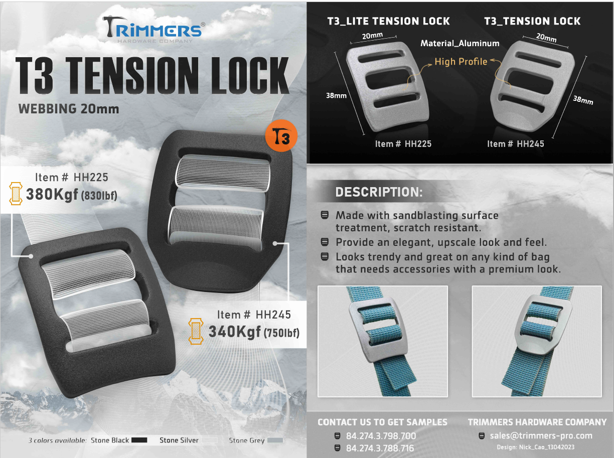 Korean About usCompanyCompany IntroductionCompany ProfileCILocationBusinessBusiness InformationOffice & FactoryCore ValuesOur CustomersStrengthsQuality ControlMaterialDesign & DevelopmentNon-stop Production ProcessIntegrated Structural DesignNewsCompany NewsOversea ShowTrimmers Booth Position OROutdoor Friedrichshafen, DEOutdoor Winter Market 2016Outdoor Friedrichshafen, DEOutdoor Summer Market 2016Trimmers Booth Position OROutdoor Friedrichshafen, DEOutdoor Retailer + Snow ShowISPO Munich Show 2018ISPO Munich Show 20192019 Outdoor Retailer SnowISPO Munich Show Jun,2019Company ActivitiesProduct NewsRetractable HandleBottom Compartment SystemsWheelZipper PullerMetal ComponentPlasticFrameBlogTipsMachineryProductsTravel & GearBottom CompartmentXAD Bottom CompartmentCaliber SeriesEdge Bottom CompartmentMalibu SeriesLocomo SeriesAkita SeriesSuperlite seriesHybrid seriesSantana SeriesHybrid SeriesHJHASDAAll In One SystemsRecessed Spinner Wheel SeriesSpaceShip seriesFeatherLite seriesRetractable HandleAkitaLocomoCruiser seriesCaliber seriesHybrid seriesSpeedLite seriesSuperLite seriesLooperColeIbiza seriesMalibu seriesIce Breaker seriesSolsticeWheelMalibu SeriesAkita SeriesSantana Spinner WheelSpinner Wheel seriesLocomo WheelCruiser seriesCaliber seriesHybrid seriesSuperLite seriesSpeedLite seriesIceBreaker seriesBow TypeLoop seriesTradi seriesSolstice SeriesPlastic ComponentEnd Cap BuckleLadderLockCordLockWebbing TiePower StrapViper Power StrapCamlockPivot HookLoopTriglideD-RingFoot and RailTop / Side HandleProtector & Skid PlateFoot & RailTop HandleLogoLogo PlateSkid Plate & ProtectorProtectorSkid PlateTactical & SafetySide-release BuckleT8_LayerT9_ShieldBags & ApparelsMetal ComponentTension HookShorty Tension HookClip HookSnap HookD-RingTension RingTriglideTension LockToggleLoopWeb ButtonContinental DividerTrekking HolderSternum SliderPull TapCam Tension HookCamlockSR BuckleTent StakeAluminum RulerMetal End TapStructural FrameCarabinerCarabinerCarabinerT3T3 PROBeltBeltZipper PullerZipper PullerMetAstics™AluticaPlasticWeb HandleCamping & OverlandCommute CarrierSnow ShoesChairContactContact InfoHEADGERMANYITALIAKOREAJAPANUKISRAEL About usCompanyCompany IntroductionCompany ProfileCILocationBusinessBusiness InformationOffice & FactoryCore ValuesOur CustomersStrengthsQuality ControlMaterialDesign & DevelopmentNon-stop Production ProcessIntegrated Structural DesignNewsCompany NewsOversea ShowTrimmers Booth Position OROutdoor Friedrichshafen, DEOutdoor Winter Market 2016Outdoor Friedrichshafen, DEOutdoor Summer Market 2016Trimmers Booth Position OROutdoor Friedrichshafen, DEOutdoor Retailer + Snow ShowISPO Munich Show 2018ISPO Munich Show 20192019 Outdoor Retailer SnowISPO Munich Show Jun,2019Company ActivitiesProduct NewsRetractable HandleBottom Compartment SystemsWheelZipper PullerMetal ComponentPlasticFrameBlogTipsMachineryProductsTravel & GearBottom CompartmentXAD Bottom CompartmentCaliber SeriesEdge Bottom CompartmentMalibu SeriesLocomo SeriesAkita SeriesSuperlite seriesHybrid seriesSantana SeriesHybrid SeriesHJHASDAAll In One SystemsRecessed Spinner Wheel SeriesSpaceShip seriesFeatherLite seriesRetractable HandleAkitaLocomoCruiser seriesCaliber seriesHybrid seriesSpeedLite seriesSuperLite seriesLooperColeIbiza seriesMalibu seriesIce Breaker seriesSolsticeWheelMalibu SeriesAkita SeriesSantana Spinner WheelSpinner Wheel seriesLocomo WheelCruiser seriesCaliber seriesHybrid seriesSuperLite seriesSpeedLite seriesIceBreaker seriesBow TypeLoop seriesTradi seriesSolstice SeriesPlastic ComponentEnd Cap BuckleLadderLockCordLockWebbing TiePower StrapViper Power StrapCamlockPivot HookLoopTriglideD-RingFoot and RailTop / Side HandleProtector & Skid PlateFoot & RailTop HandleLogoLogo PlateSkid Plate & ProtectorProtectorSkid PlateTactical & SafetySide-release BuckleT8_LayerT9_ShieldBags & ApparelsMetal ComponentTension HookShorty Tension HookClip HookSnap HookD-RingTension RingTriglideTension LockToggleLoopWeb ButtonContinental DividerTrekking HolderSternum SliderPull TapCam Tension HookCamlockSR BuckleTent StakeAluminum RulerMetal End TapStructural FrameCarabinerCarabinerCarabinerT3T3 PROBeltBeltZipper PullerZipper PullerMetAstics™AluticaPlasticWeb HandleCamping & OverlandCommute CarrierSnow ShoesChairContactContact InfoHEADGERMANYITALIAKOREAJAPANUKISRAEL Company News Oversea ShowTrimmers Booth Position OROutdoor Friedrichshafen, DEOutdoor Winter Market 2016Outdoor Friedrichshafen, DEOutdoor Summer Market 2016Trimmers Booth Position OROutdoor Friedrichshafen, DEOutdoor Retailer + Snow ShowISPO Munich Show 2018ISPO Munich Show 20192019 Outdoor Retailer SnowISPO Munich Show Jun,2019Company Activities Product News Retractable HandleBottom Compartment SystemsWheelZipper PullerMetal ComponentPlasticFrame Blog TipsMachinery T3_Tension Lock PDF Download v Other News Alutica Tilt Head: Bottle Opener Tension Lock (HH164) & Bottle Opener D-Ring (HH146) Item#: HH164 & HH146 T3 PRO_Loop Item#: HH235 T3 PRO D-ring (HH226) & T3 PRO Double D-ring (HH227) Item#: HH226 & HH227 T3 PRO (Shorty) Tension Hook Item#: HH228 & HH229 T3 PRO_Triglide Item#: HH321 T3 PRO_Webbing Toggle Item#: HH244 e-Catalogue HARDWARE OF TRAVEL & CAMPING 2024 HARDWARE OF BAGS & APPARELS 2024 METAL & PLASTIC COMPONENT T3 PRO_METAL COMPONENT (*) Required Information (*) Required Information (*) Required Information Download Product Highlights Metal / Plastic / Zip-pull P.7 Metal / Plastic / Zip-pull P.6 Metal / Plastic / Zip-pull P.5 Metal / Plastic / Zip-pull P.4 Metal / Plastic / Zip-pull P.3 Metal / Plastic / Zip-pull P.2 Metal / Plastic / Zip-pull P.1 Handles / Wheels / Hard shell P.3 Handles / Wheels / Hard shell P.2 Handles / Wheels / Hard shell P.1 Frame Flyers